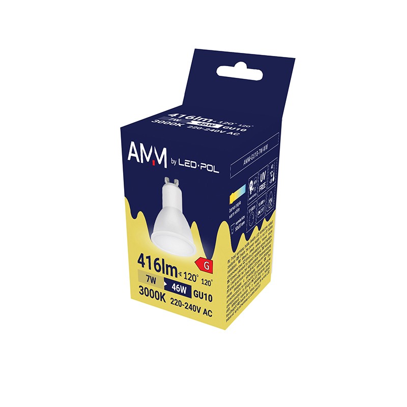 | AMM-GU10-7W-WW | AMM01003 | 5901752712836 | 7W | 416 | 3000 | 61 | 0,5 | 120 | 46 | - |