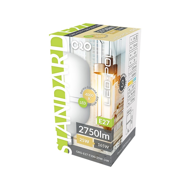 | ORO-E27-T100-25W-DW | ORO04110 | 5902533194360 | 25W | 2750 | 4000 | 120 | 0,9 | 320 | 165 |